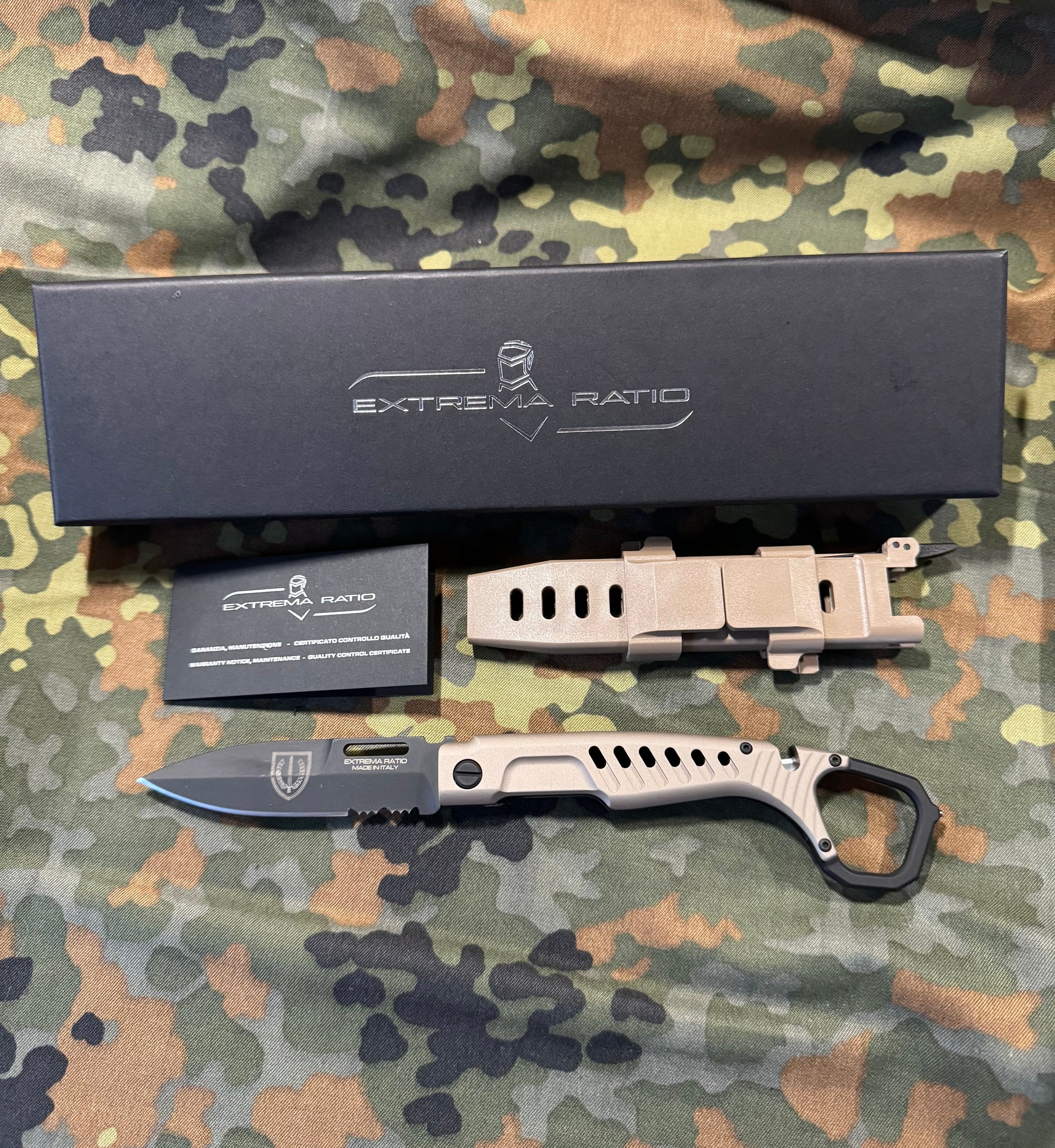 Die Klinge besteht aus Böhler N690-Stahl (58 HRC) mit brünierter Oberfläche und eingraviertem KSK-Logo. Am Klingenansatz befindet sich eine gezahnte Schneide, die die Effektivität bei schnellen und präzisen Schnitten durch hochfeste Materialien wie Seile oder verstärkte Gewebe erhöht. Der Verriegelungsmechanismus ist das bewährte Liner-Lock-System.